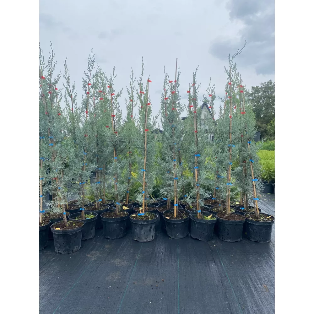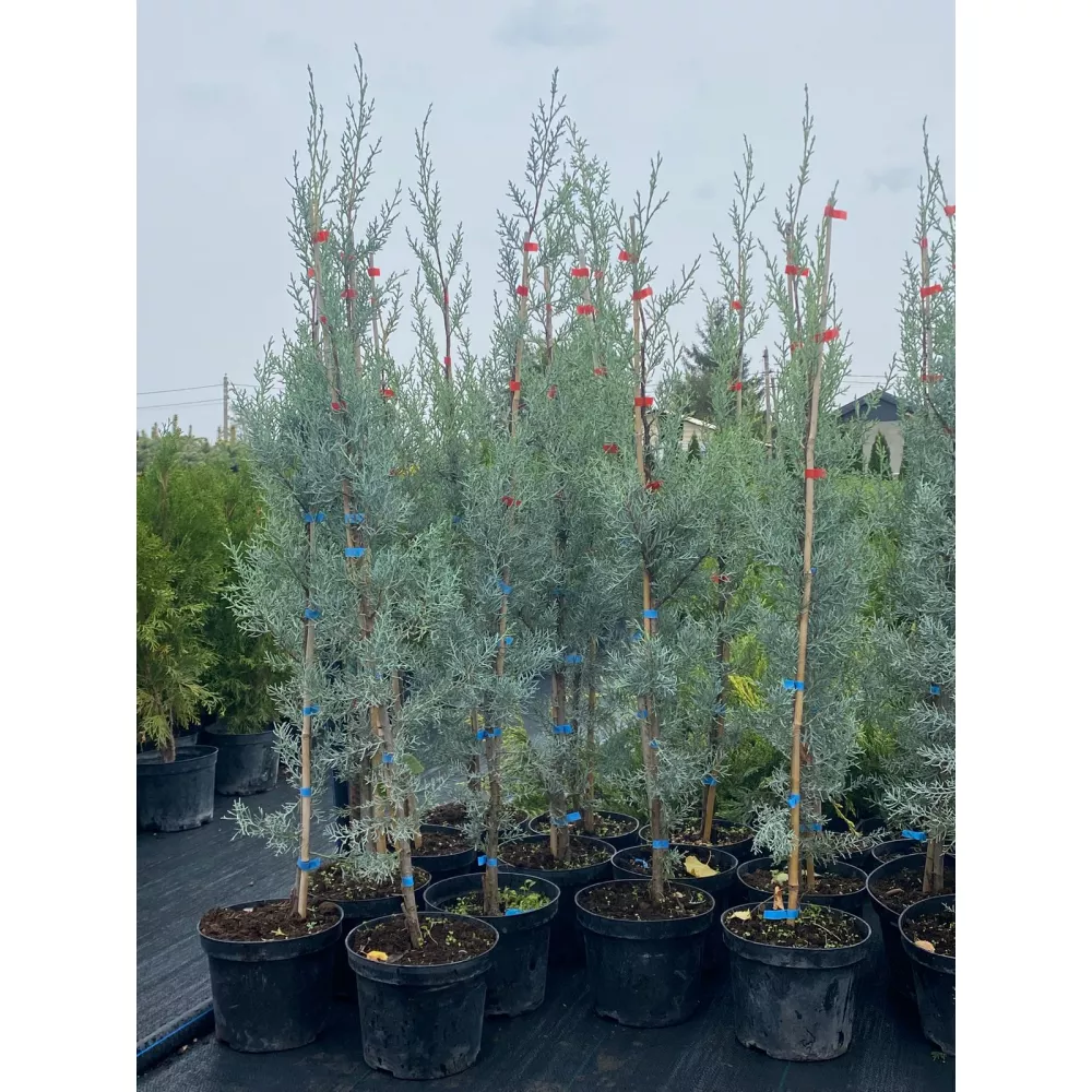 Кипарис аризонский — декоративный вечнозелёный кипарис с выразительной серебристо‑зелёной хвоей и плотной конусовидной формой. Саженцы высотой 1–1,2 м идеально подходят для формирования аллей, живых изгородей, групповых посадок и солитерных композиций у дома или террасы. Растение демонстрирует хорошую засухоустойчивость и выносит бедные, дренированные почвы, предпочитая солнечные участки. При посадке обеспечьте хороший дренаж и регулярный полив в первый год для лучшего укоренения; дальнейший уход минимален — периодическая подкормка и санитарная обрезка по необходимости. Кипарис аризонский привлекает внимание контрастной хвои, медленным формированием декоративной плотной кроны и способностью создавать структурные зелёные акценты в ландшафте. Отличный выбор для тех, кто ищет эффектное, но неприхотливое растение.
