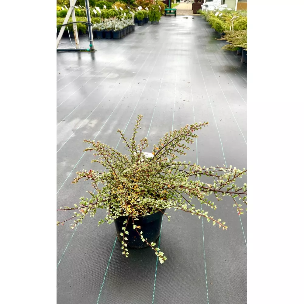 Низкий, широко растущий декоративный кустарник с пёстрой листвой — кизильник горизонтальный Variegatus привлекает внимание аккуратной «решётчатой» облиственной структурой, нежными белыми цветками весной и ярко‑красными ягодами осенью. Отличный выбор для рокариев, склонов, миксбордеров и как почвопокровное растение.