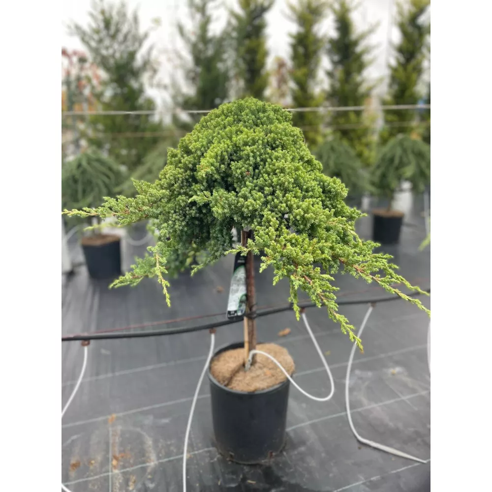 Штамбовый можжевельник Juniperus conferta 'Nana' представляет собой готовый декоративный элемент ландшафта: ровный штамб и густая куполообразная крона высотой около 60 см. Сорт отличается медленным ростом, плотной структурой хвои серо‑зелёного оттенка и высокой устойчивостью к ветровым нагрузкам и солевому аэрозолю, поэтому он особенно ценен для прибрежных садов и открытых участков. Низкие требования в уходе и эффектный вид круглый год делают растение универсальным решением для рокариев, террас, контейнерных композиций и одиночных акцентов в саду.