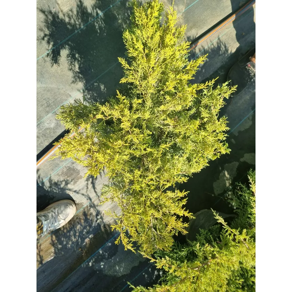 - Яркая декоративная окраска — золотисто-жёлтая хвоя, заметная в любой сезон;