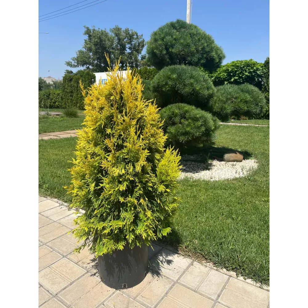 Туя складчатая Forever Goldi — декоративная хвойная культура с насыщенной золотистой листвой, которая особенно эффектно смотрится весной и летом. В возрасте 90–100 см она уже формирует аккуратную конусовидную крону и подходит как для создания акцентов на участке, так и для плотных живых изгородей среднего роста.